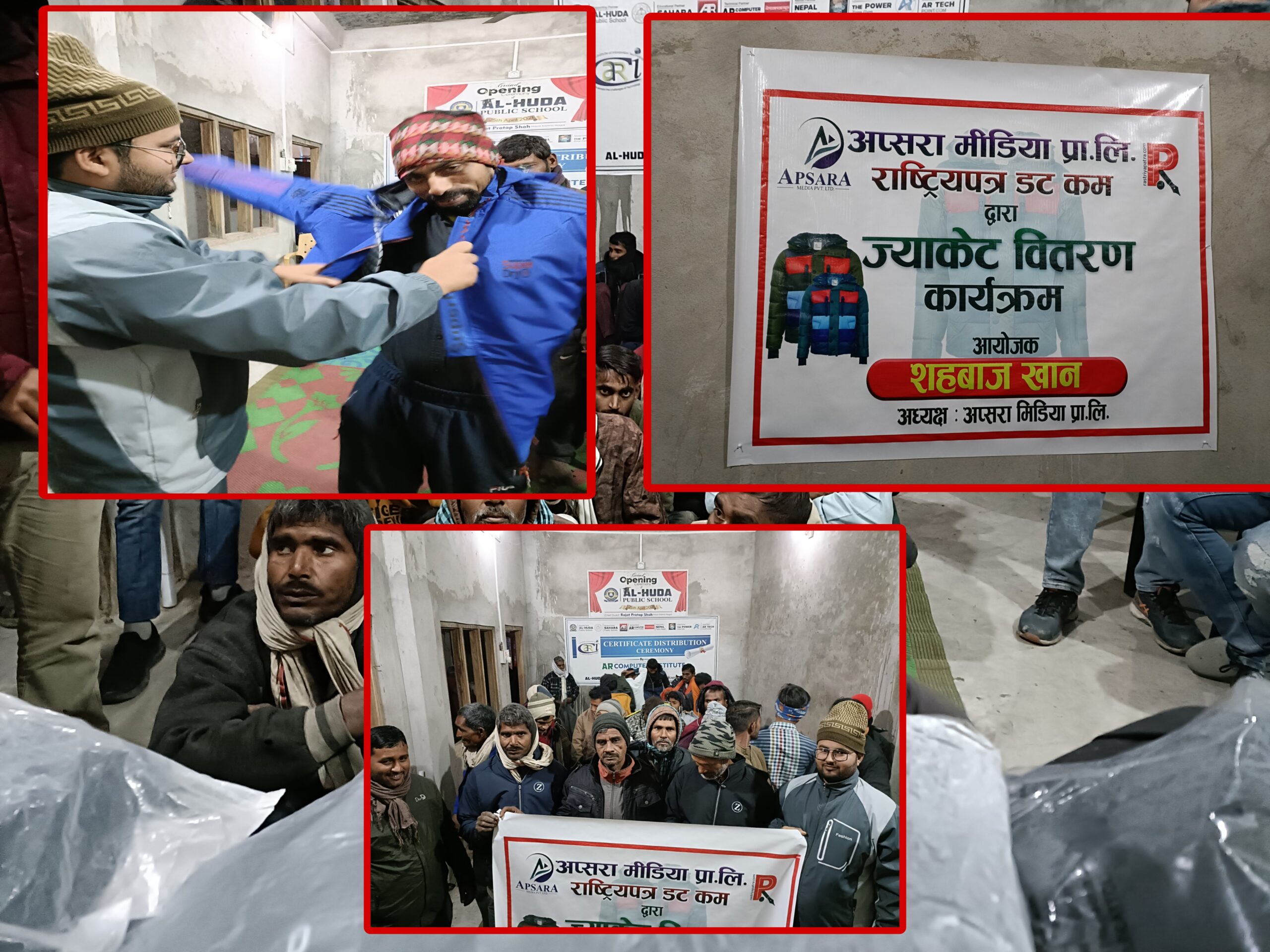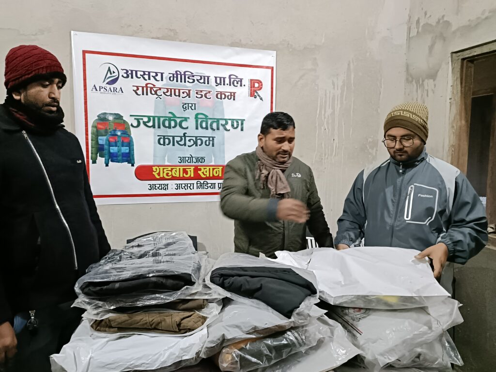 दिन प्रतिदिन जाडाे बढ्दै गएकाेले गरिब, असहाय तथा एकल परिवारका व्यक्ति लाई ज्याकेट वितरण गरिएको तथा सो ज्याकेटबाट जाडोमा न्यानो हुने विश्वास अप्सरा मिडिया प्रा. लि. का अध्यक्ष संचार कर्मी शहबाज खान ले बताए ।