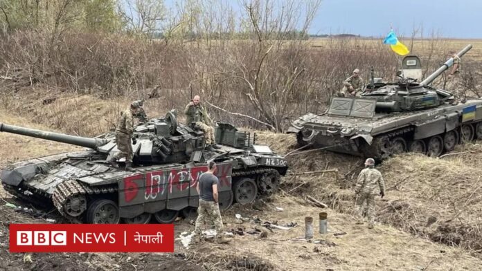 परित्याग गरिएका रुसी ट्याङ्कमाथि युक्रेनी सेनाहरू